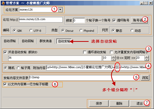 10、所有的设置好了之后,我们只要点击保存按钮即可,如下图7所示;退出管理方案,回到主界面,我们选择刚才建立的方案,然后点击登陆,小蜜蜂自动发帖机就开始工作了,小蜜蜂就会按我们方案设置的时间随机一个时间进行发帖;