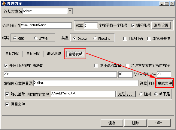 4、 6、设置好后,我们点击“生成文件”按钮,软件就会自动从标题文件和内容文件里面抽取内容生成新的txt文件,生成的新文件就可以用来发帖用,保存在上面设置的目录里面,我们再使用小蜜蜂自动发帖功能指向这个目录,小蜜蜂发帖机就会自动开发发帖了