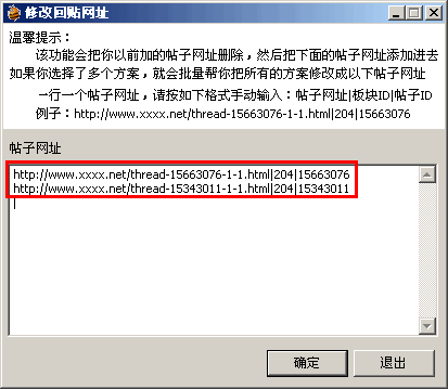 2、一行一个帖子网址,请按如下格式手动输入:帖子网址|板块ID|帖子ID(如何得到论坛板块ID和主题ID:http://www.9ibee.com/softhelp/huitieji/39.html