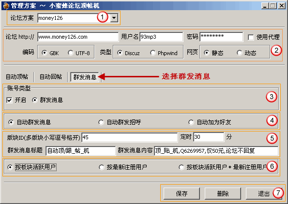 2、进入方案管理窗口,选择“群发消息”页面 ->> 账号类型处选择“开启”群发消息,如下图3所示 3、选择群发消息类型,如下图4所示,其中有: 4、填写板块ID(一般这个是在群发消息给板块活跃用户的时候用到,也就是从这个板块里面搜索活跃用户群发消息,如何得到论坛板块ID和主题ID),群发消息定时器的时间(最小值是1分钟),群发消息标题,群发消息内容,如下图5所示 5、选择群发消息用户类型,如下图6所示,其中有: 6、以上设置好后,点保存按钮即可,如下图7所示